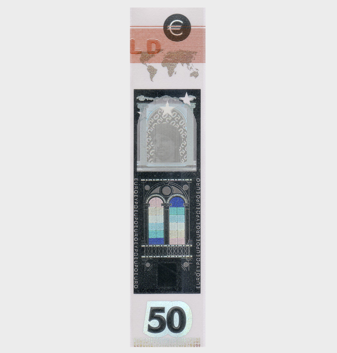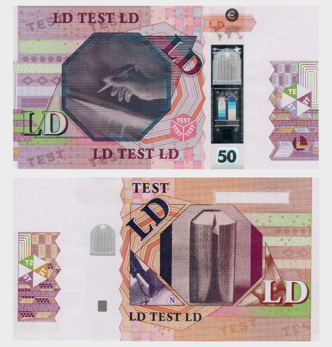 | Observation: | The “LD TEST” banknotes already have the security elements provided for euro banknotes. The purpose of their existence was in fact to validate the feasibility study for the production of new euro banknotes. “LD TEST” The first type with a holographic strip, as in banknotes: 20,50,100,200 Euro “€” |